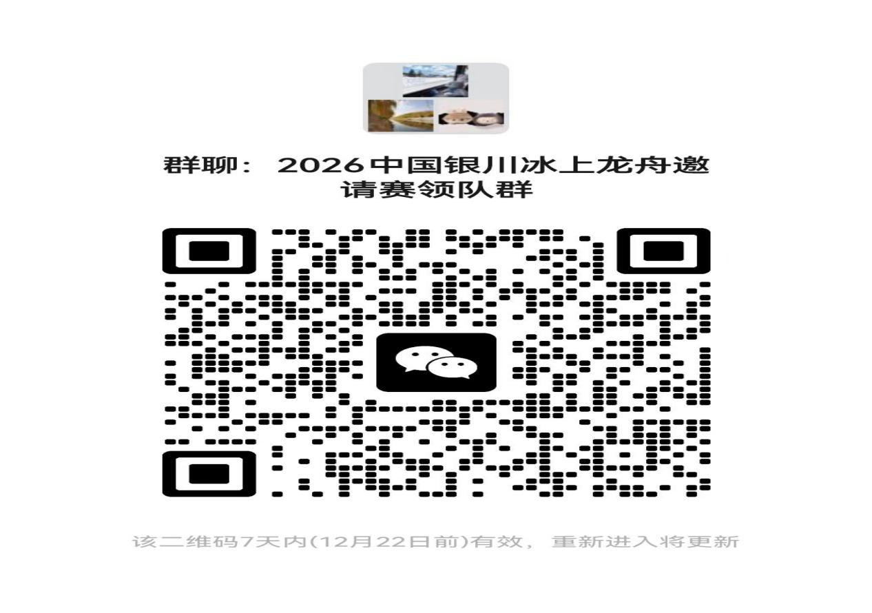 1.將上述材料掃描件(PDF格式,命名規則:單位名稱+2025-2026中國銀川冰上龍舟邀請賽報名材料)發送至組委會指定郵箱。各單位領隊請掃描下方二維碼,加入本次運動會的工作聯絡群。